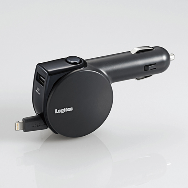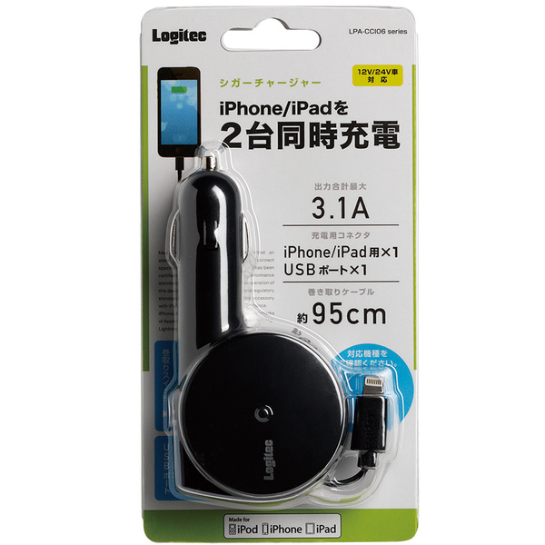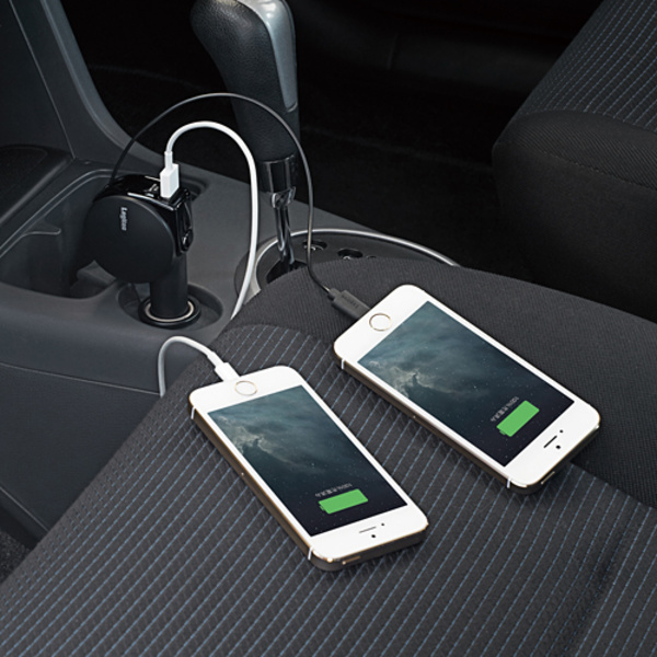 最大出力合計3.1Aの車載充電器。Lightning部は巻き取り可能なリールタイプです。最大二台の機器を同時に充電。