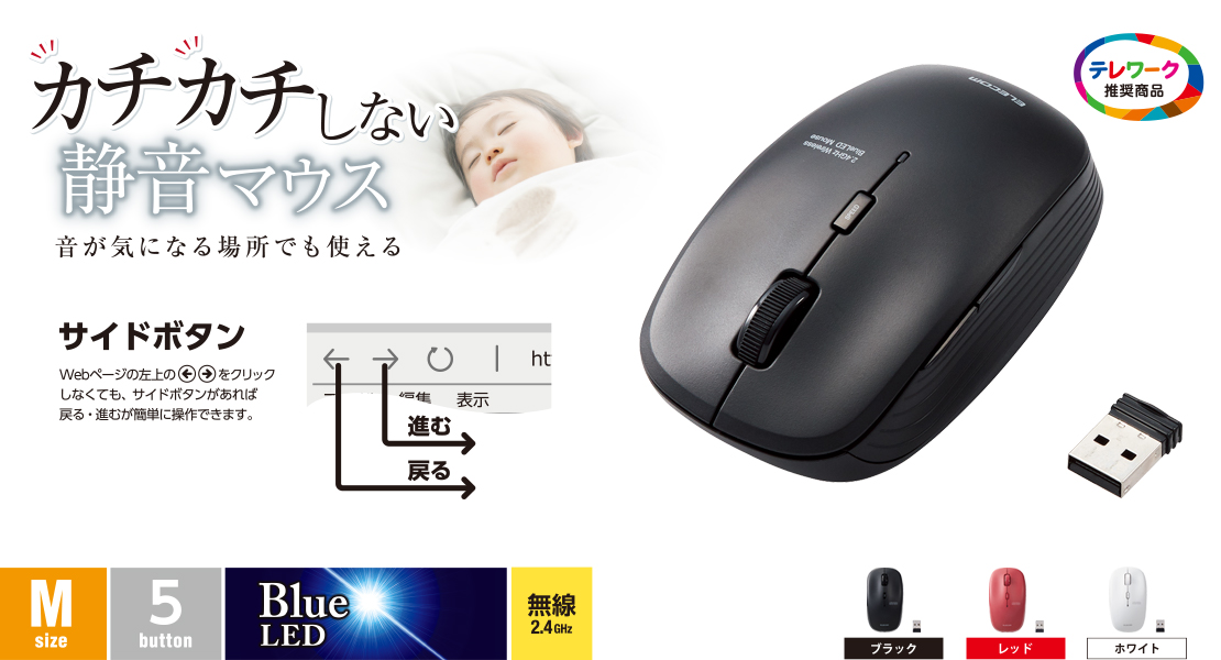 ネットの閲覧などの操作に便利な「進む」・「戻る」ボタンが付いた5ボタンワイヤレスBlueLEDマウス。