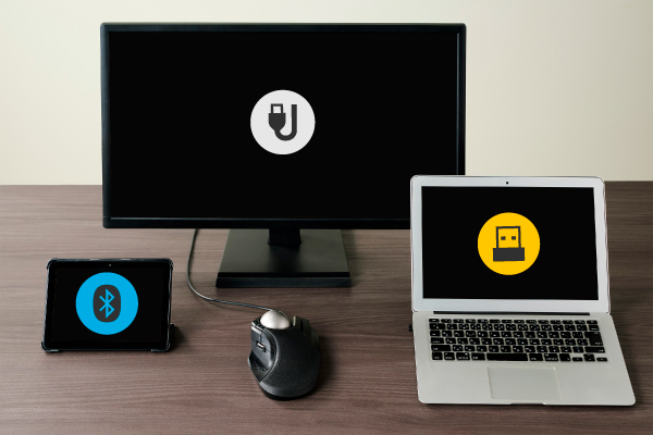 [USB2.4GHz 無線・Bluetooth®・有線]3種の接続方式を採用。 それぞれ1台ずつ、合計3台まで同時接続可能です。 接続方式に縛られず、本製品1台で用途を使い分けて接続できます。
