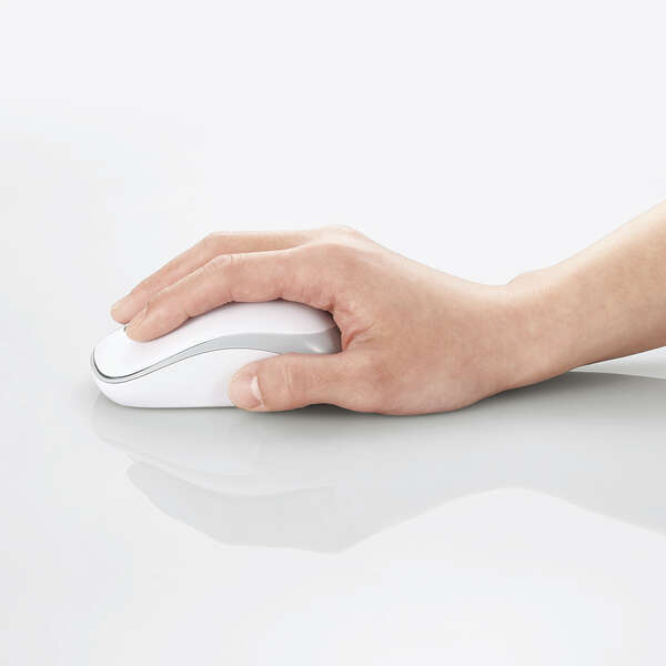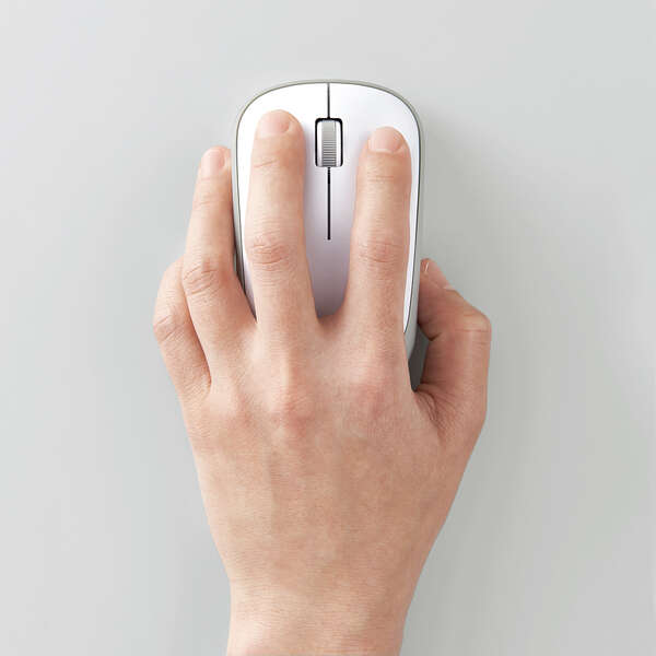ノートパソコンのUSBポートに接続しても気にならず、装着したまま持ち運び可能な1円玉サイズのマイクロレシーバを採用しています。レシーバはマウス本体内に収納できるため、持ち運び時のレシーバの紛失を防ぎます。