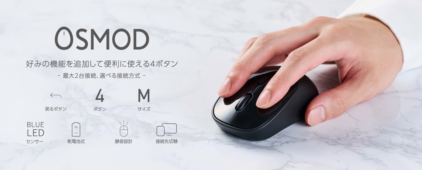 シンプルな左右対称形状に、静音ボタンや2台接続可能なマルチペアリング機能を搭載。カスタマイズ可能なファンクションボタンで毎日の作業効率化もサポートする、OSMOD(オスモッド)シリーズの4ボタンマウス ワイヤレスモデルです。