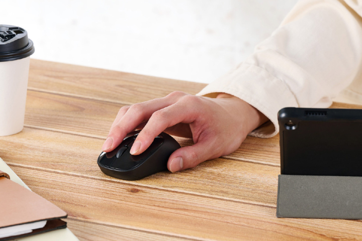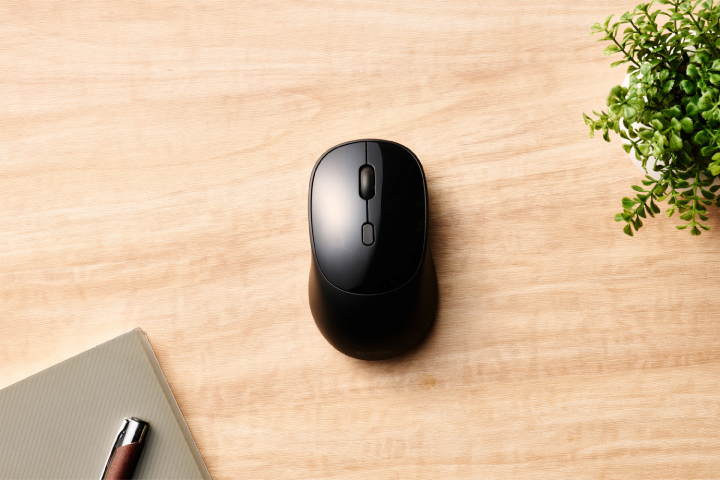 左右ボタンとチルトホイールには静音スイッチを採用。 クリックしてもカチカチ音が響きません。 ミーティング中やリビング・カフェ、シェアオフィスなど周りに人がいる場面でも音を気にせず使えます。