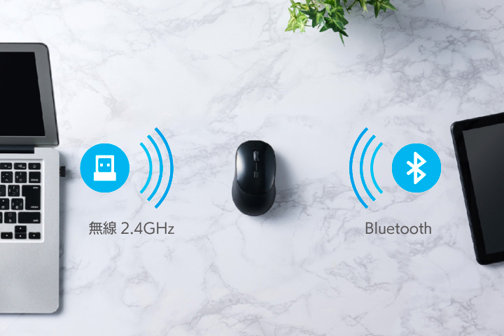 パソコンのUSB-Aポートにレシーバーを挿すだけの無線2.4GHz接続と、USB-Aポートのないパソコンやタブレットでも使えるBluetooth®接続の両方に対応するワイヤレスモデルです。