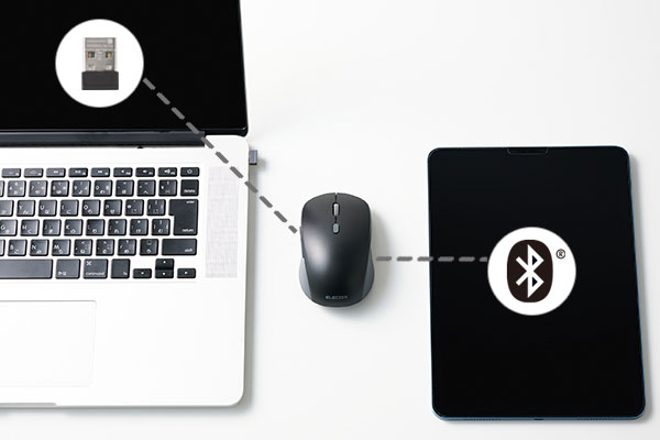 パソコンのUSB-Aポートにレシーバーを挿すだけの無線2.4GHz接続と、USB-Aポートのないパソコンやタブレットでも使えるBluetooth®接続の両方に対応するワイヤレスモデルです。