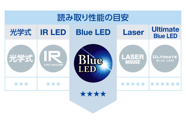 小さい凹凸やホコリがある環境でも正確にポインターを動かせるBlueLEDセンサーを搭載することで、木材・樹脂・ガラス製のデスクや、ノート、テーブルクロスの上などでも快適に操作できます。