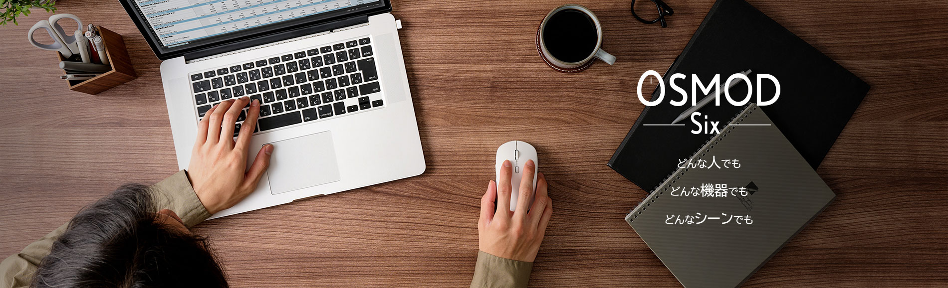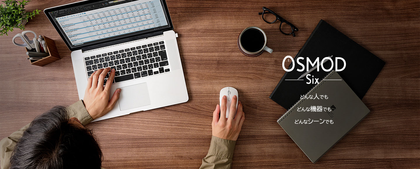 左右対称のなだらかな形状に本当にほしい機能だけを詰め込んだ、シンプルで使いやすいマウスシリーズ・OSMOD(オスモッド)です。