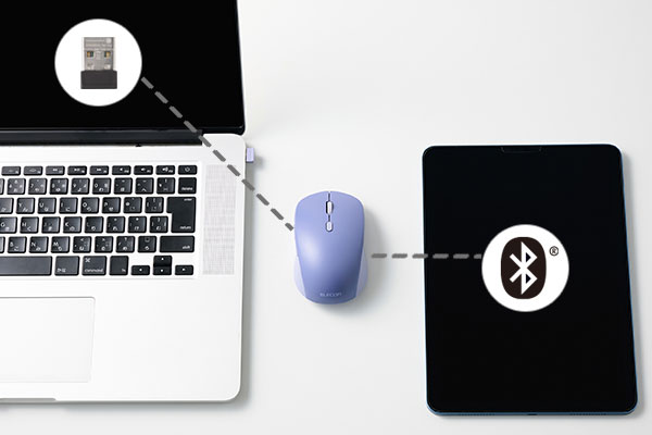 パソコンのUSB-Aポートにレシーバーを挿すだけの無線2.4GHz接続と、USB-Aポートのないパソコンやタブレットでも使えるBluetooth®接続の両方に対応するワイヤレスモデルです。
