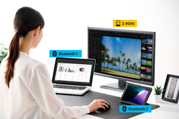 最大3台接続可能な“マルチペアリング機能”を搭載しています。 無線2.4GHz接続で1台、Bluetooth接続で2台まで接続機器を本体に保存できます。 接続先は本体上部のスイッチで切り替えられます。