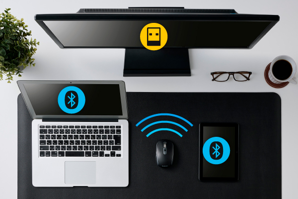 パソコンのUSB-Aポートにレシーバーを挿すだけの無線2.4GHz接続と、USB-Aポートのないパソコンやタブレットでも使えるBluetooth®接続の両方に対応するワイヤレスモデルです。