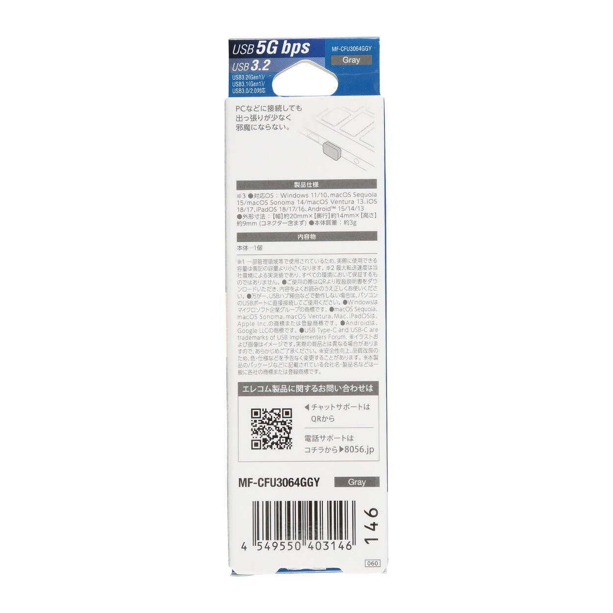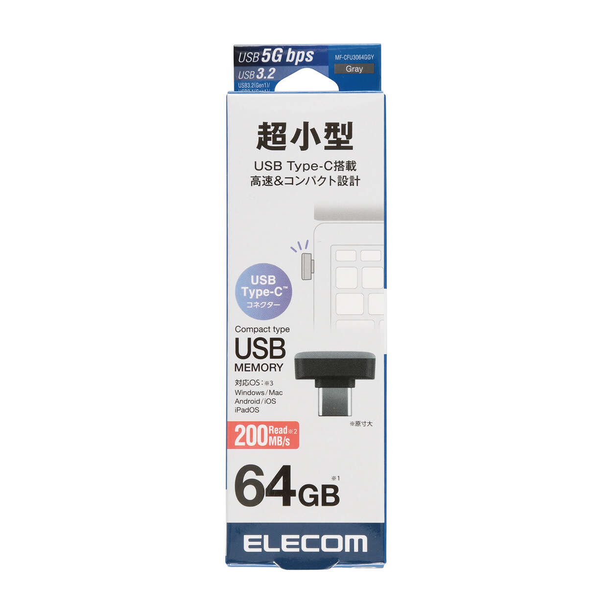 超小型サイズで、ノートパソコンに挿したままでも邪魔にならないUSB Type-C(TM)コネクター搭載のUSBメモリです。USB 5Gbps(USB 3.2(Gen1)/USB 3.1(Gen1)/USB3.0)対応で、最大200MB/sの高速読み込みを実現しています。容量64GBです。