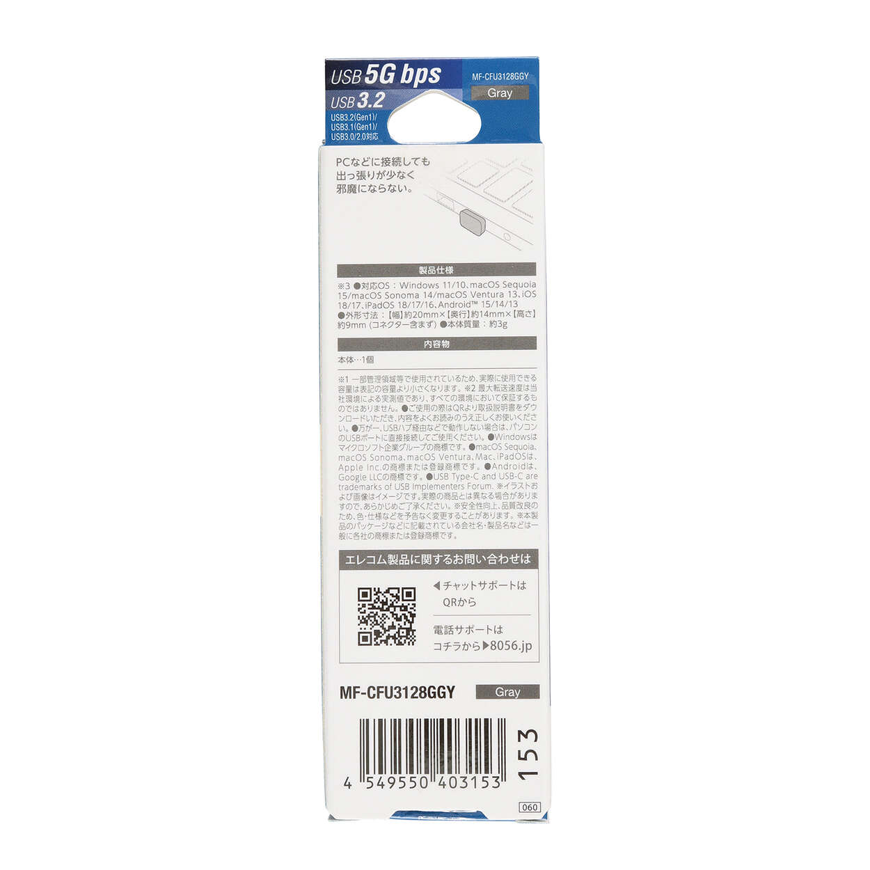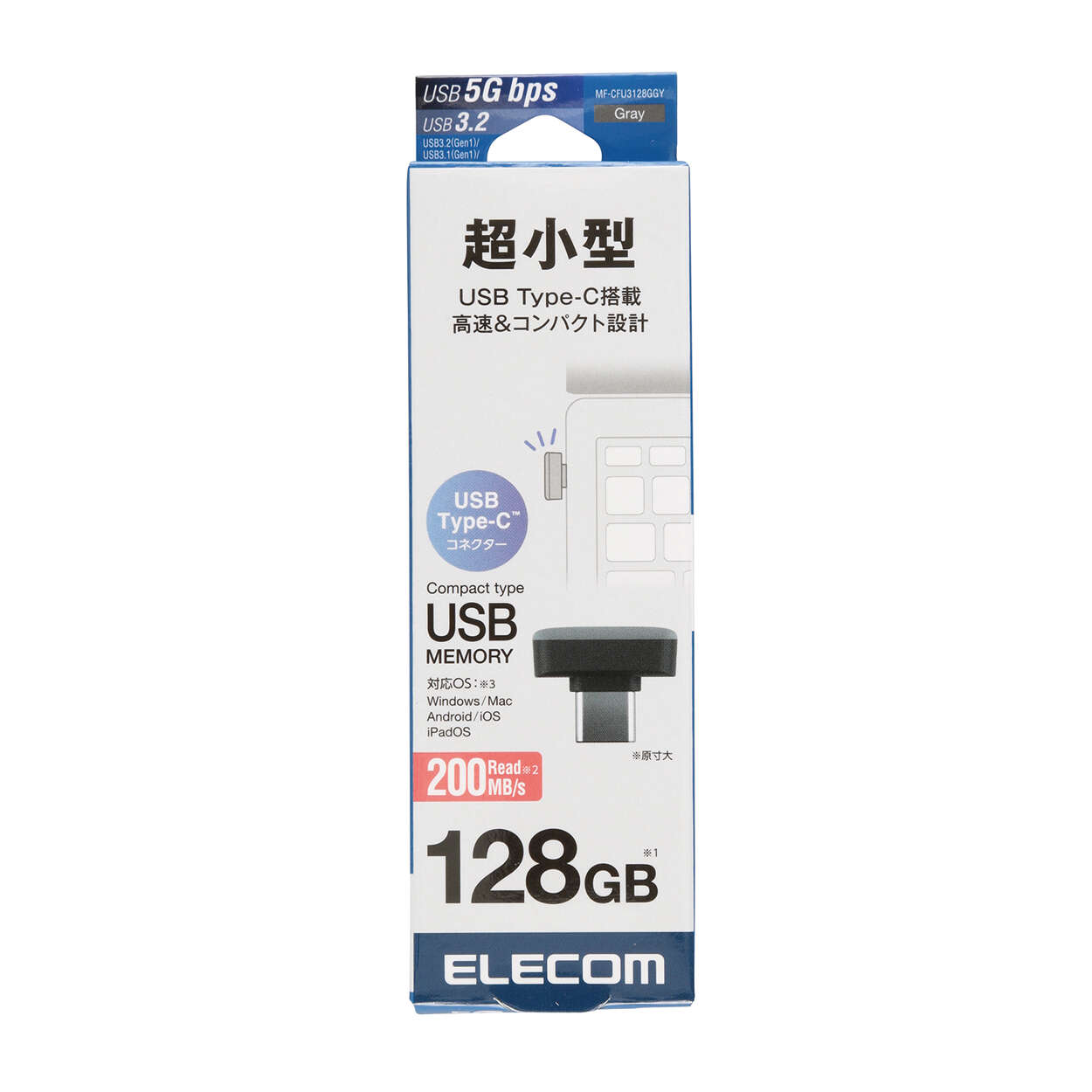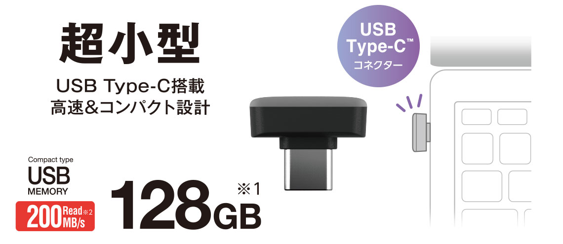 超小型サイズで、ノートパソコンに挿したままでも邪魔にならないUSB Type-C(TM)コネクター搭載のUSBメモリです。USB 5Gbps(USB 3.2(Gen1)/USB 3.1(Gen1)/USB3.0)対応で、最大200MB/sの高速読み込みを実現しています。容量128GBです。