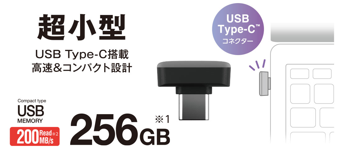 超小型サイズで、ノートパソコンに挿したままでも邪魔にならないUSB Type-C(TM)コネクター搭載のUSBメモリです。USB 5Gbps(USB 3.2(Gen1)/USB 3.1(Gen1)/USB3.0)対応で、最大200MB/sの高速読み込みを実現しています。容量256GBです。