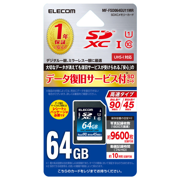 万が一、大切なデータが消えても無償でデータ復旧サービスを利用できる特典付き。読み出し最大90MB/s、書き込み最大45MB/sの高速データ転送を実現する、UHS-Ⅰ対応のSDメモリカード。