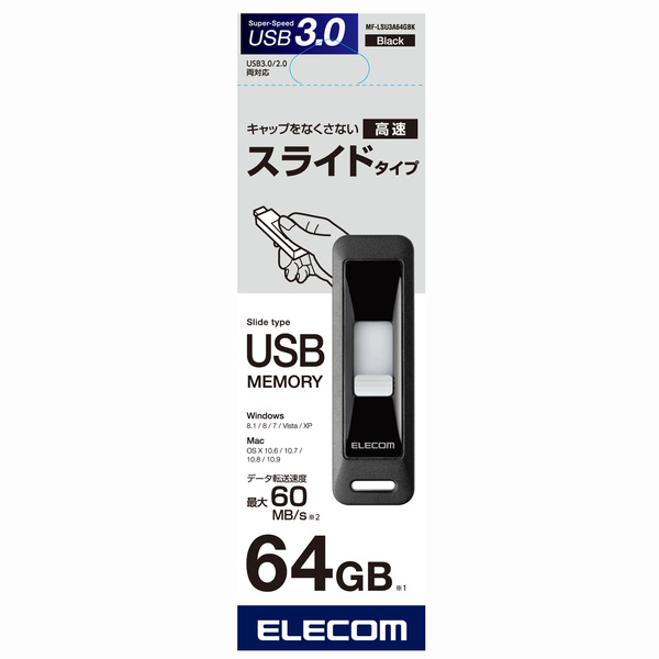 スライド方式だからキャップを紛失する心配不要。USB3.0対応で、最大60MB/sの高速データ転送を実現するUSBメモリ。