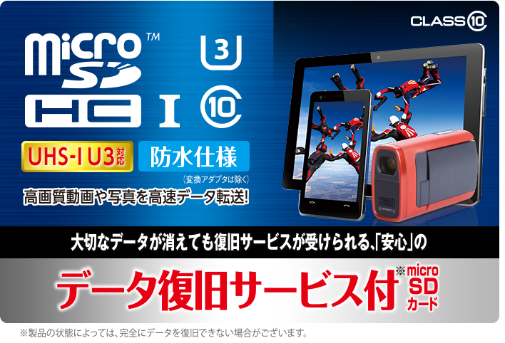 高速インターフェース規格であるUHS-I/UHSスピードクラスの「Class3」に対応した高速タイプのmicroSDメモリカードです。
