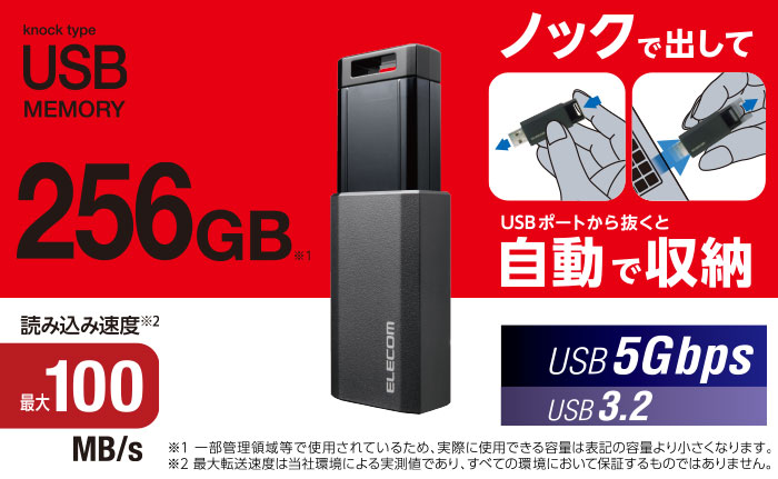 片手でワンプッシュのラクラク接続!ノックで出して自動で収納できる、ボールペンのようについつい押したくなるUSB 5Gbps(USB3.2(Gen1))対応ノック式USBメモリです。