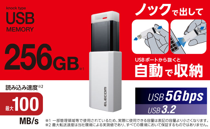 片手でワンプッシュのラクラク接続!ノックで出して自動で収納できる、ボールペンのようについつい押したくなるUSB 5Gbps(USB3.2(Gen1))対応ノック式USBメモリです。