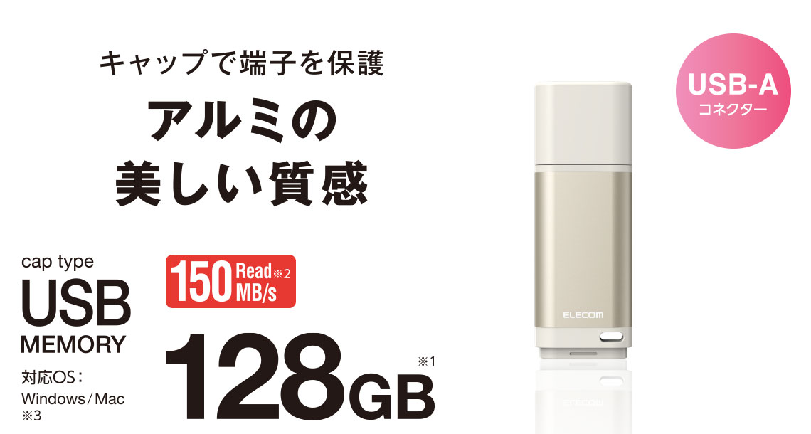 ゴミやホコリの侵入からコネクターを守る、キャップ式のUSBメモリです。