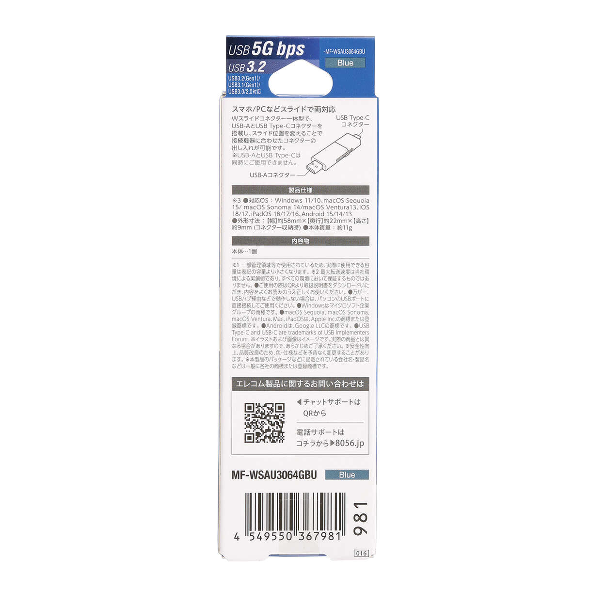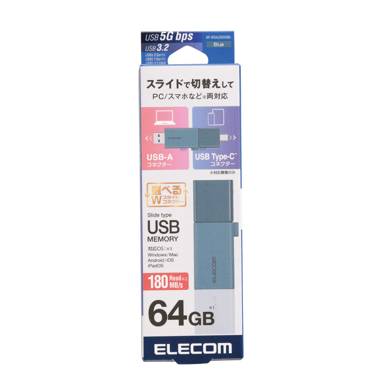 複数のデバイス間のデータ移動もこれ1つでカンタンに。USB Type-C(TM)/USB-A両方のコネクターを搭載したUSBメモリです。スライド式だからキャップを紛失する心配なし。USB 5Gbps(USB3.2(Gen1))に対応し、読み込み時最大180MB/sの高速データ転送を実現します。