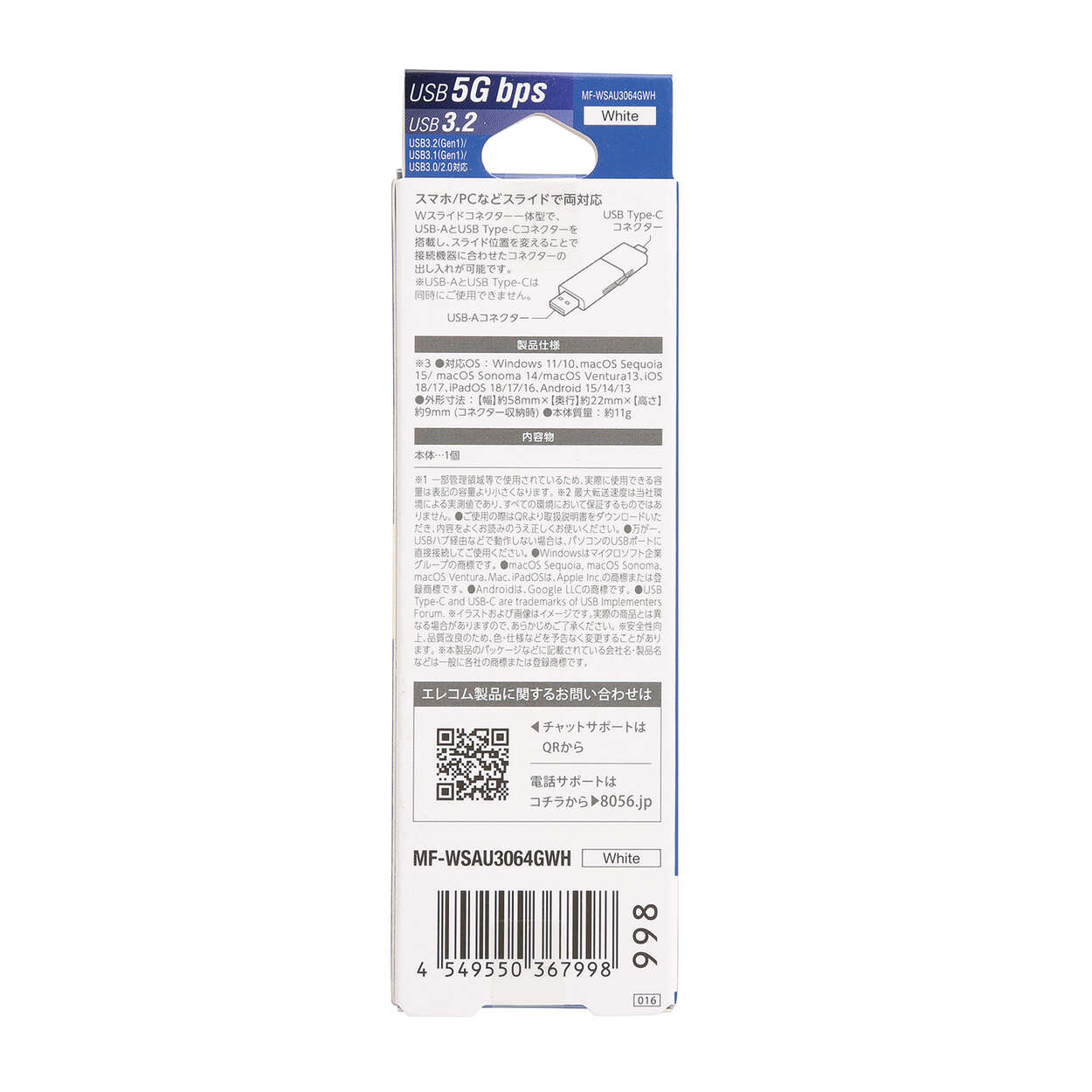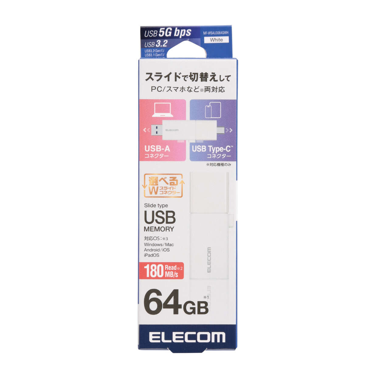 複数のデバイス間のデータ移動もこれ1つでカンタンに。USB Type-C(TM)/USB-A両方のコネクターを搭載したUSBメモリです。スライド式だからキャップを紛失する心配なし。USB 5Gbps(USB3.2(Gen1))に対応し、読み込み時最大180MB/sの高速データ転送を実現します。