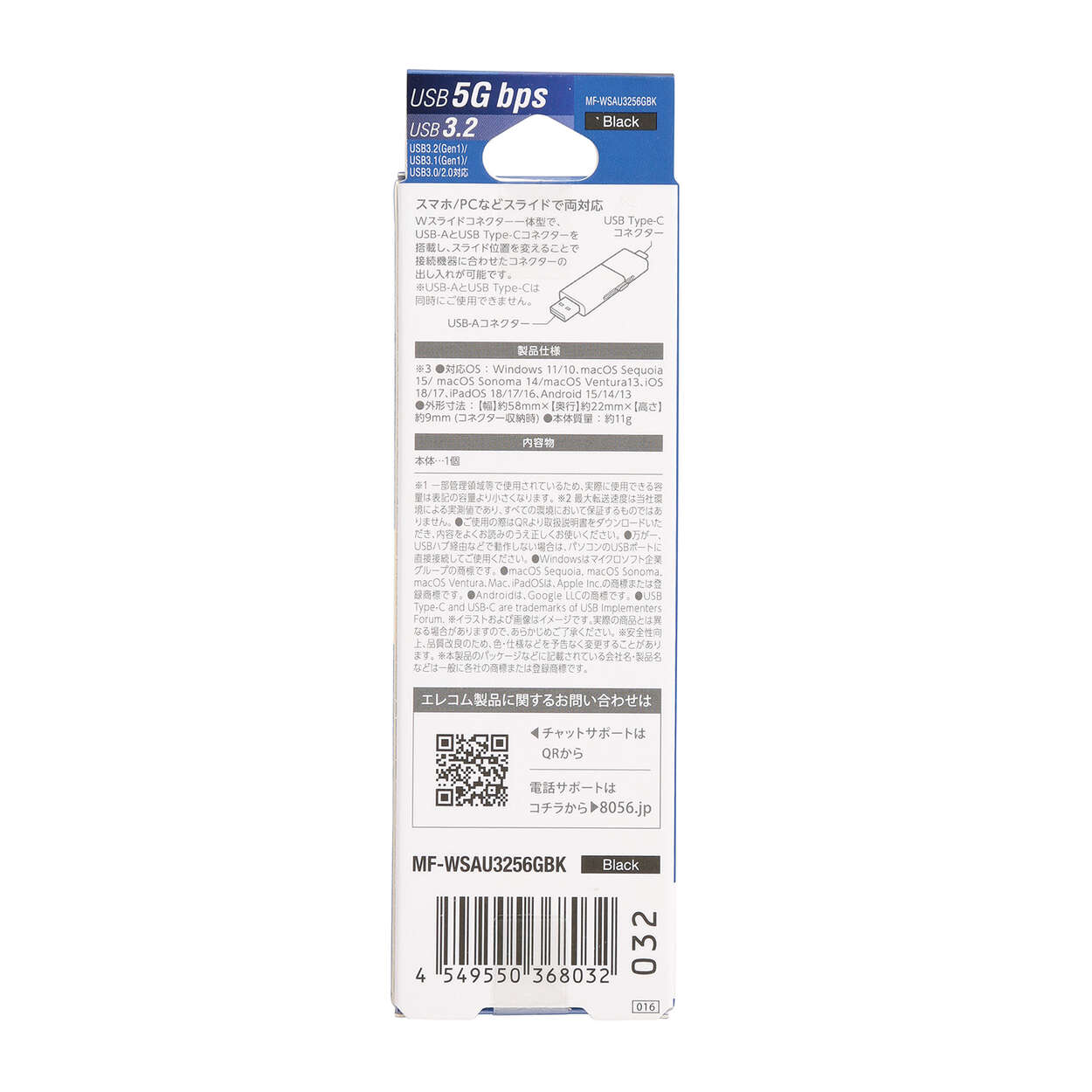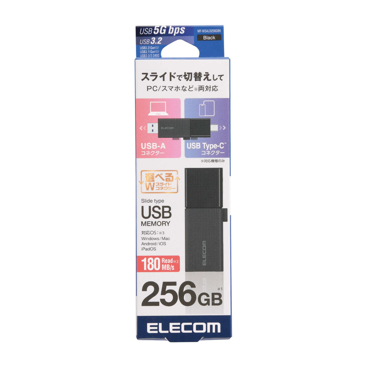 複数のデバイス間のデータ移動もこれ1つでカンタンに。USB Type-C(TM)/USB-A両方のコネクターを搭載したUSBメモリです。スライド式だからキャップを紛失する心配なし。USB 5Gbps(USB3.2(Gen1))に対応し、読み込み時最大180MB/sの高速データ転送を実現します。