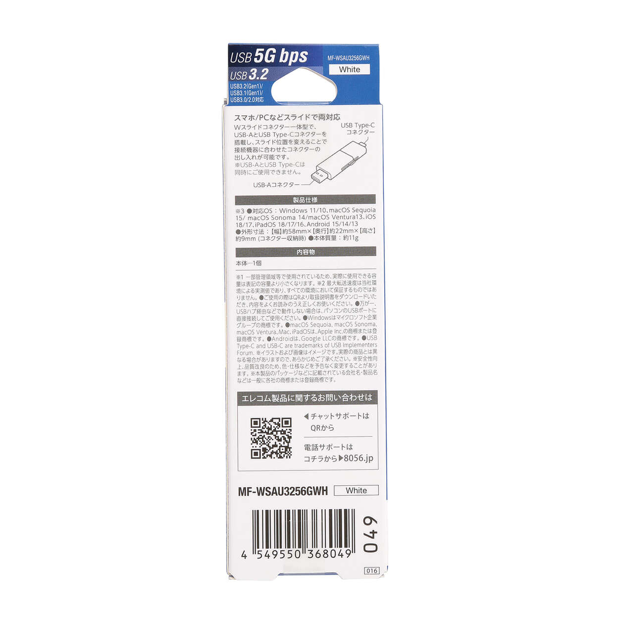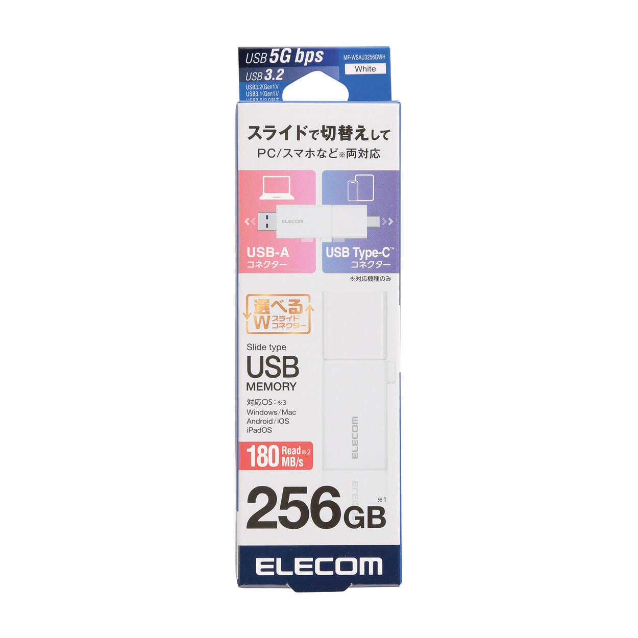 複数のデバイス間のデータ移動もこれ1つでカンタンに。USB Type-C(TM)/USB-A両方のコネクターを搭載したUSBメモリです。スライド式だからキャップを紛失する心配なし。USB 5Gbps(USB3.2(Gen1))に対応し、読み込み時最大180MB/sの高速データ転送を実現します。