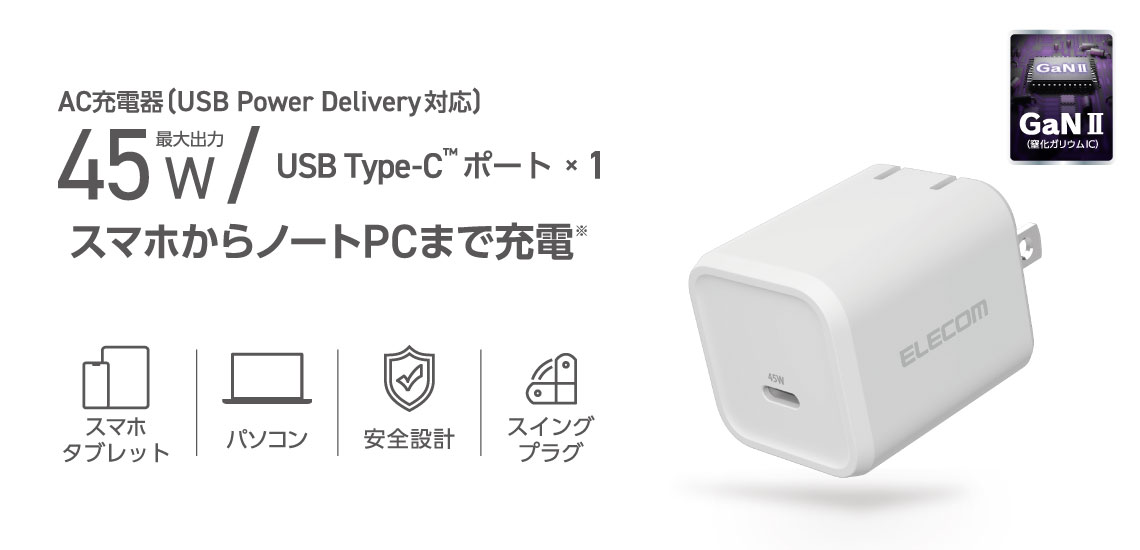 スマートフォンやタブレット、ノートパソコンをこれひとつで充電!USB Type-C(TM)ポートを搭載したAC充電器です。最大45W出力のUSB Power Deliveryに対応しています。手のひらに収まるコンパクトサイズで、外出や出張時の持ち運びにも便利です。※USB Power Delivery 45W充電に対応した機種に限ります。