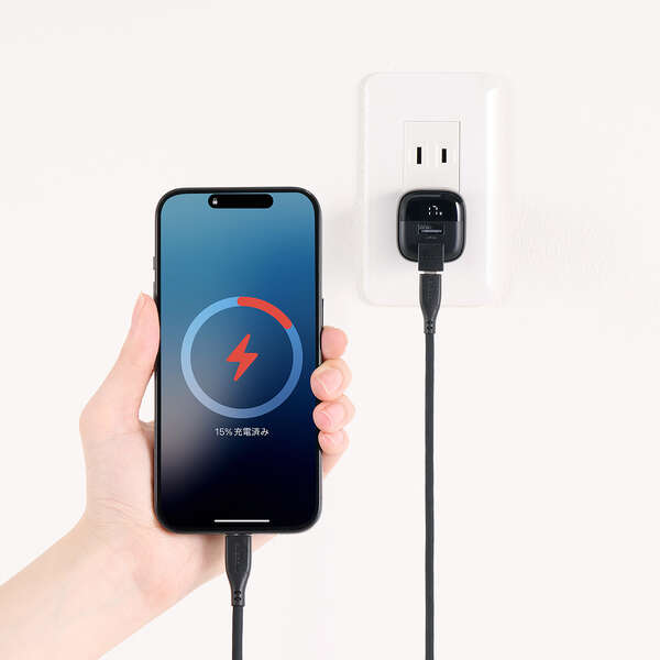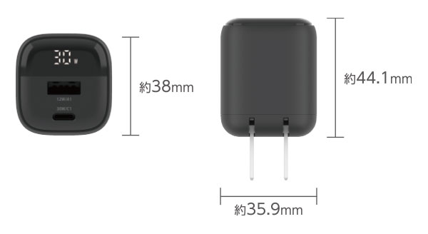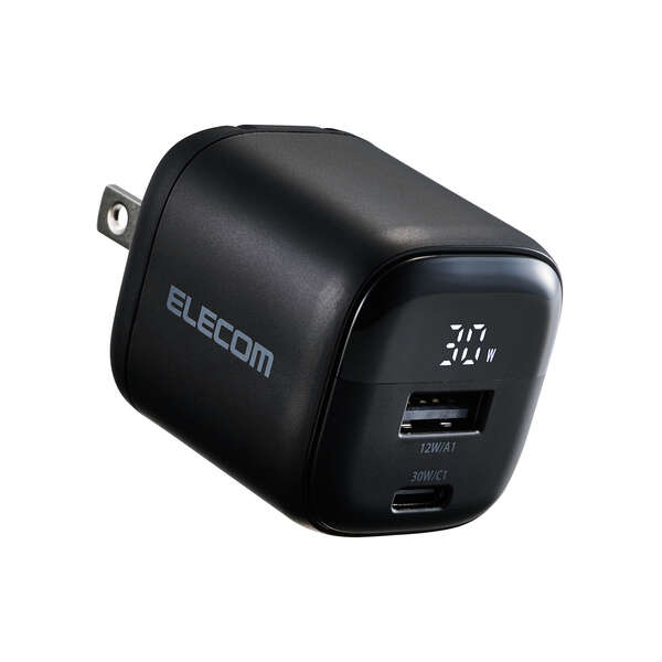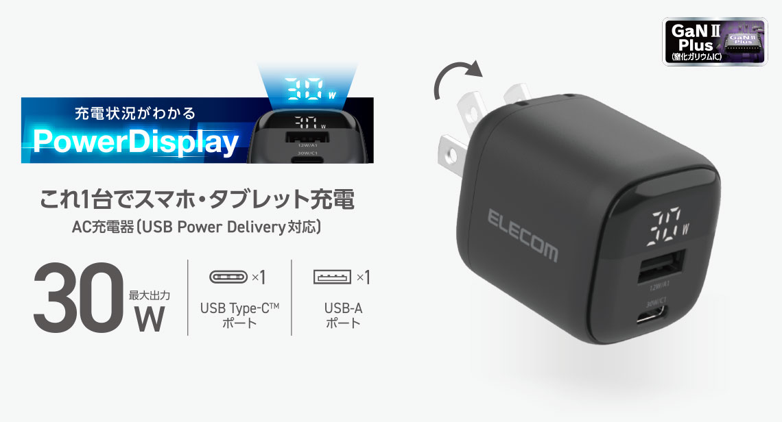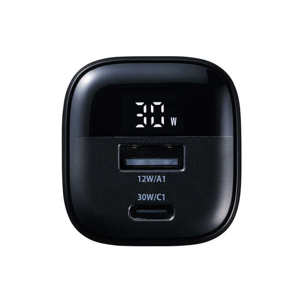 充電が見える!充電電力をリアルタイムに表示する、電力ディスプレイ付きAC充電器です。USB Type-C(TM)ポートとUSB-Aポートを搭載した、スマートフォンやタブレットを充電できるAC充電器です。最大30W出力のUSB Power Deliveryに対応し、MacBook Airなどのモバイルノートパソコンの充電も可能です。手のひらサイズで、外出や出張時の持ち運びにも便利です。 ※USB Power Delivery 30W充電に対応した機器に限ります。