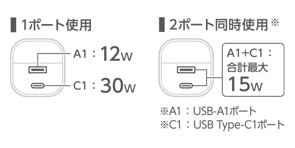 2ポート同時出力時は合計最大出力15Wとなります。(USB Power Deliveryでの出力はできません)