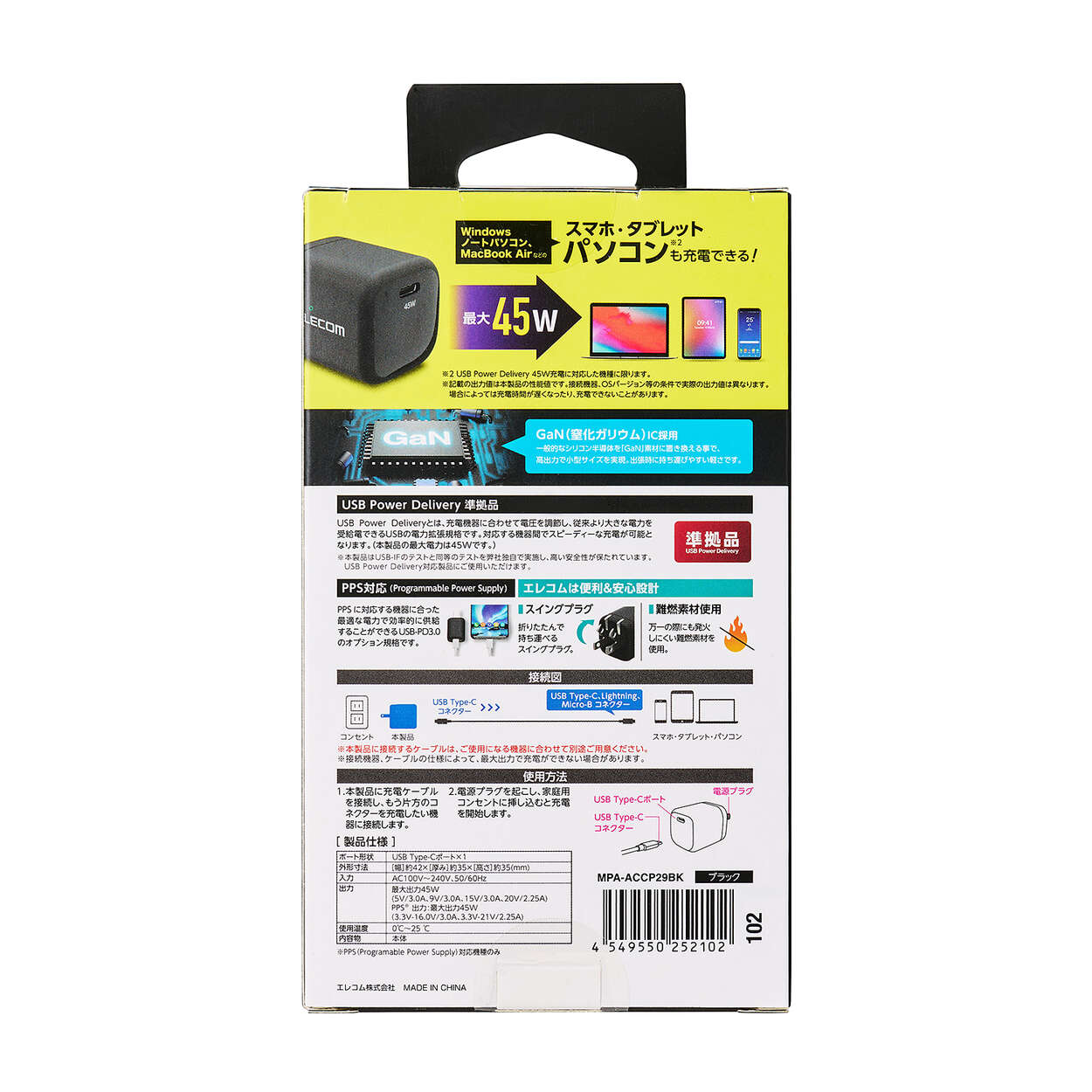 GaN(窒化ガリウム)を採用した小型で軽量、かつ高出力なUSB AC充電器です。