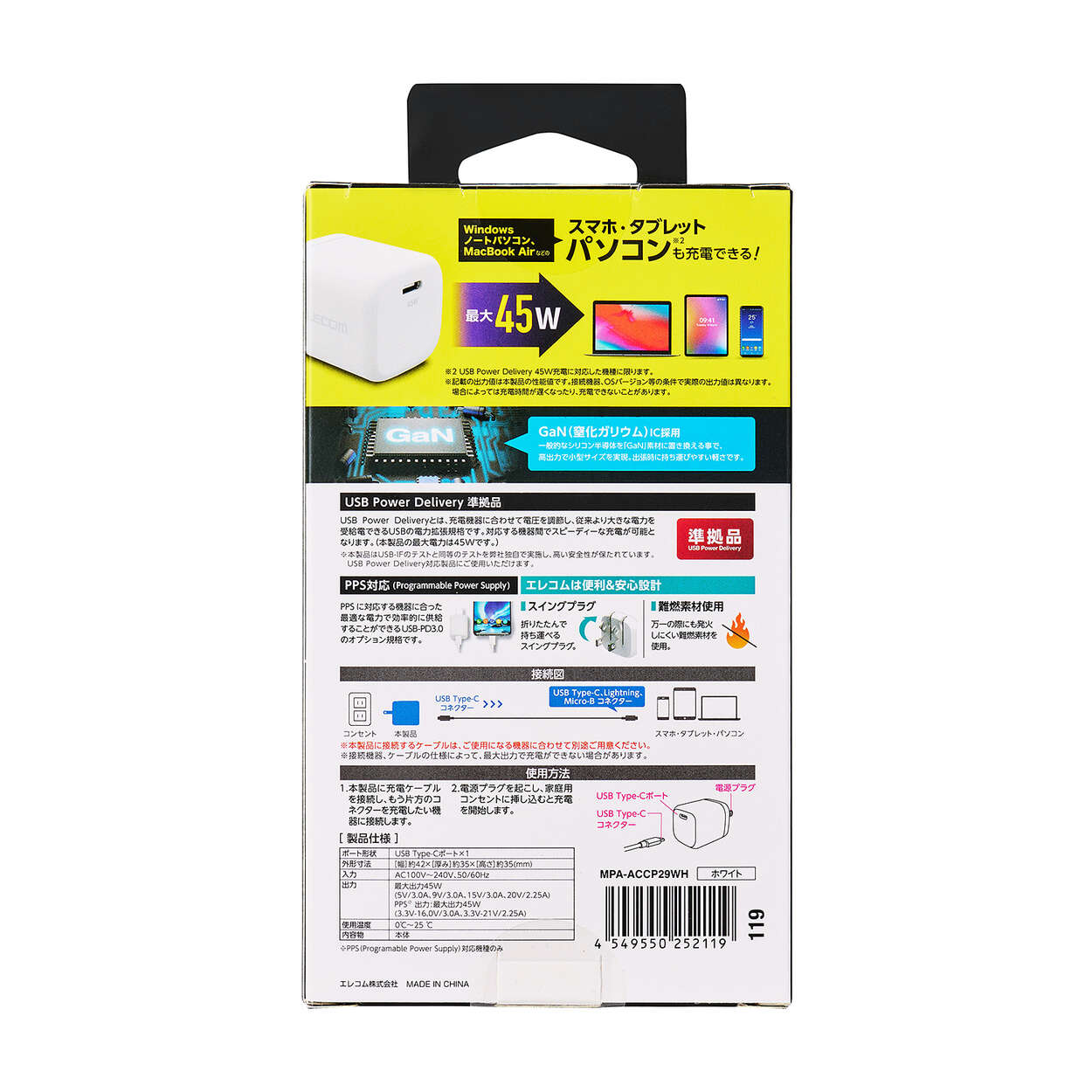 GaN(窒化ガリウム)を採用した小型で軽量、かつ高出力なUSB AC充電器です。