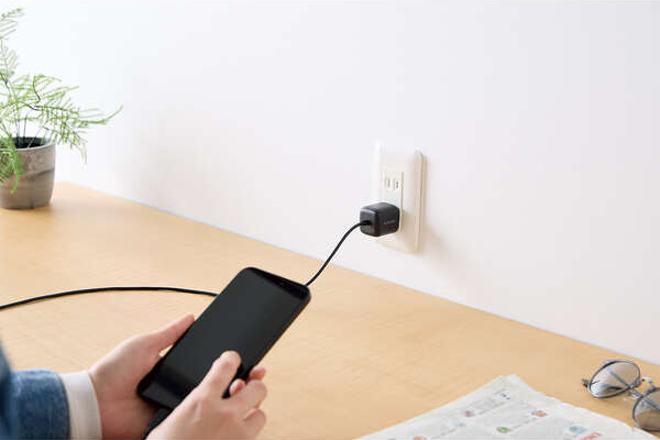 USB Power Deliveryに対応したUSB Type-Cプラグを搭載し、機器に応じて出力が5V/3A、9V/2.22A、12V/1.67Aと可変し、iPhoneなどのスマートフォン、iPadなどのタブレットを高速充電できます。