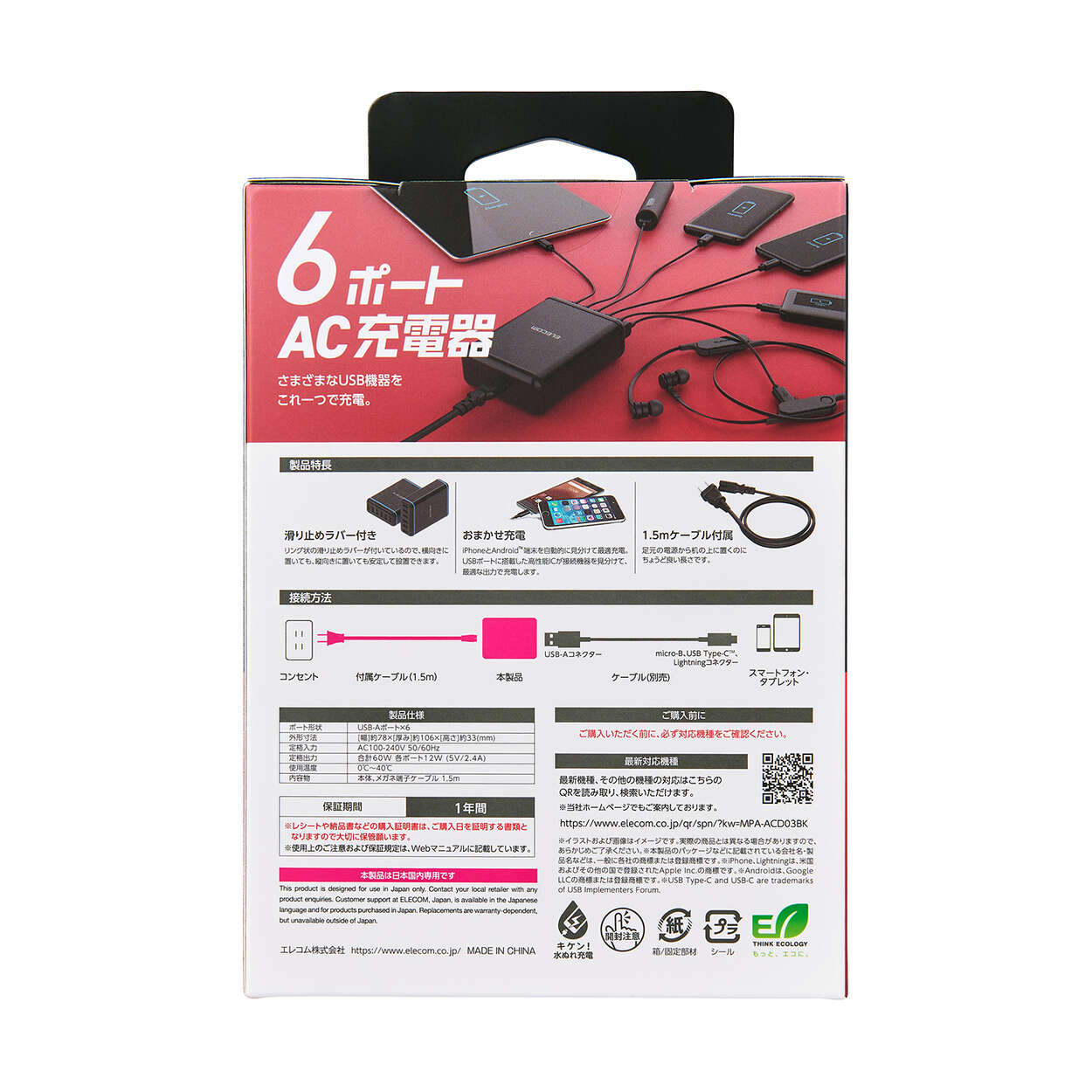6つのUSBポートを搭載し、スマートフォンやタブレットのほかさまざまなUSB機器をこれ一つで急速充電できるAC充電器です。