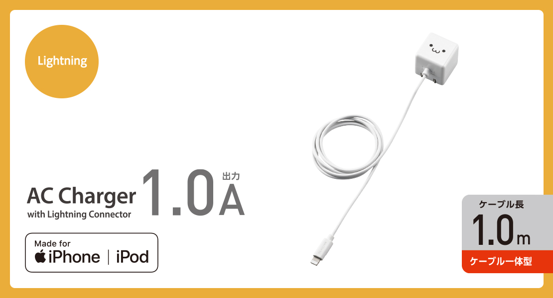家庭用コンセントからLightningコネクタ搭載のiPhoneやiPodを充電できるLightningケーブル一体型のAC充電器です。