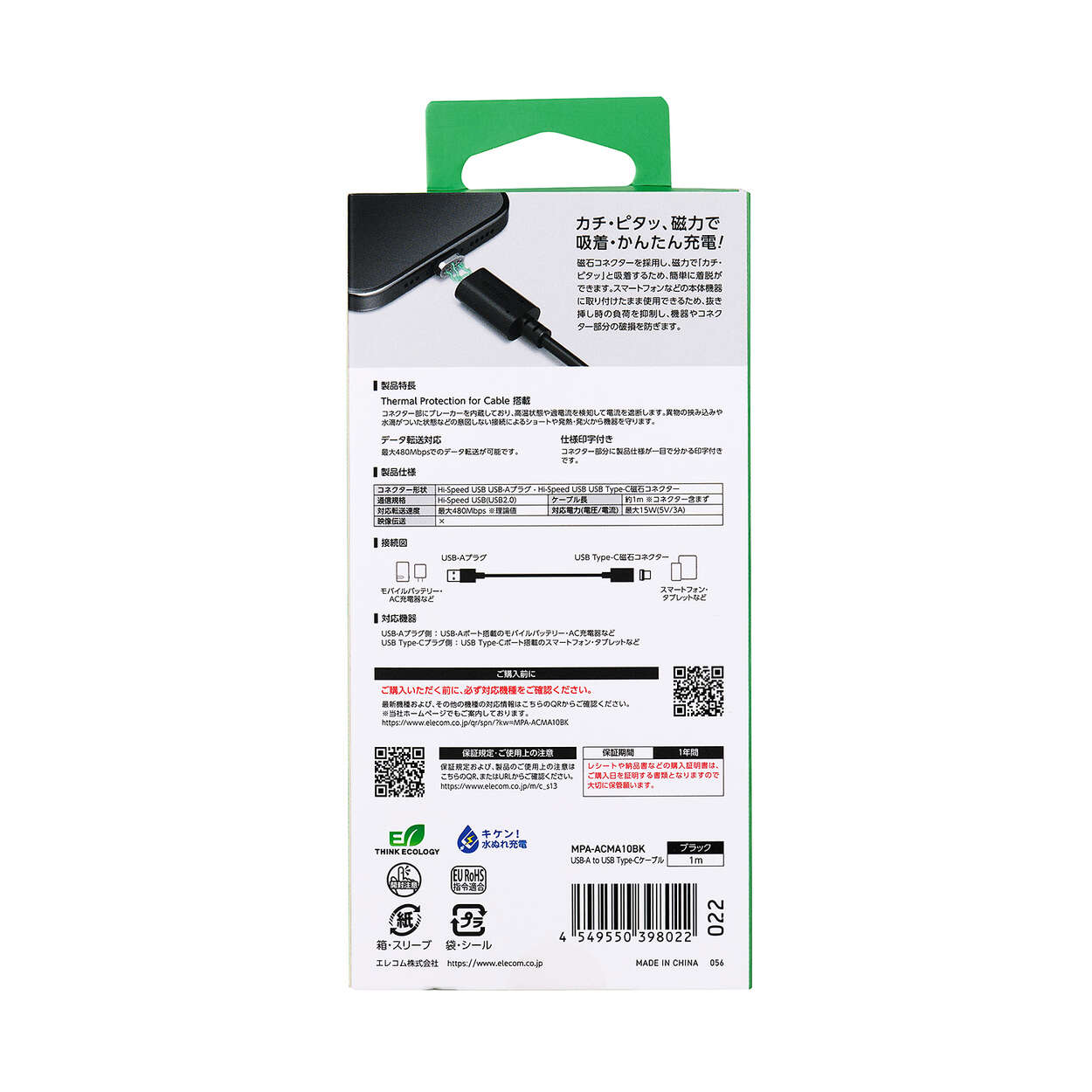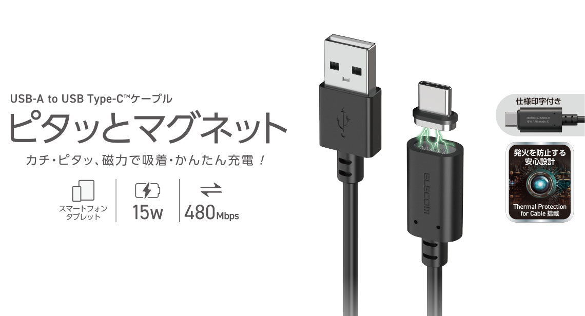 ピタッとくっついて、かんたん着脱&充電!磁力でしっかり接続するUSB Type-C(TM)着脱式コネクターを採用した、USB-A - USB Type-Cケーブルです。端子をスマートフォンなどの機器に挿したまま、ワンタッチでケーブルの着脱が可能。充電時に抜き挿しする手間がなくなり、機器やコネクター部分への負荷も軽減して長く快適に使用できます。コネクター部分にブレーカーを内蔵しているため、ホコリなどが入っても接続時のショートを防止して機器を守る安心設計です。