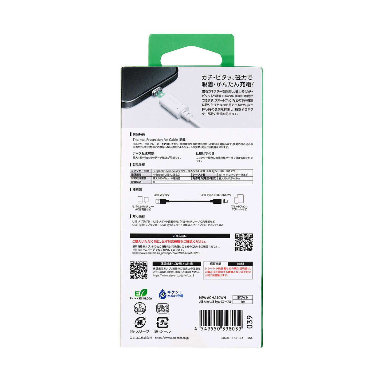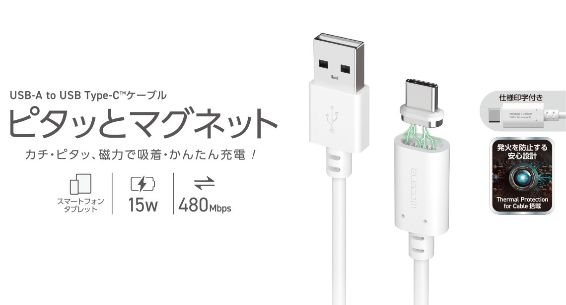 ピタッとくっついて、かんたん着脱&充電!磁力でしっかり接続するUSB Type-C(TM)着脱式コネクターを採用した、USB-A - USB Type-Cケーブルです。端子をスマートフォンなどの機器に挿したまま、ワンタッチでケーブルの着脱が可能。充電時に抜き挿しする手間がなくなり、機器やコネクター部分への負荷も軽減して長く快適に使用できます。コネクター部分にブレーカーを内蔵しているため、ホコリなどが入っても接続時のショートを防止して機器を守る安心設計です。