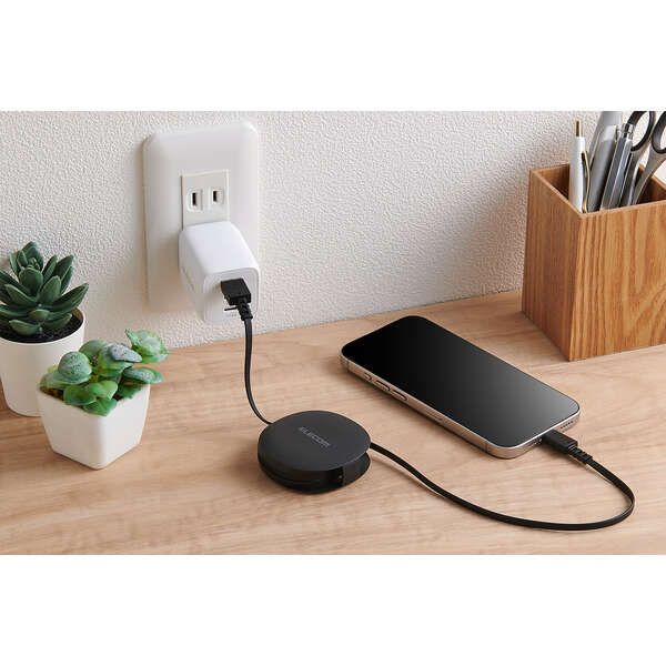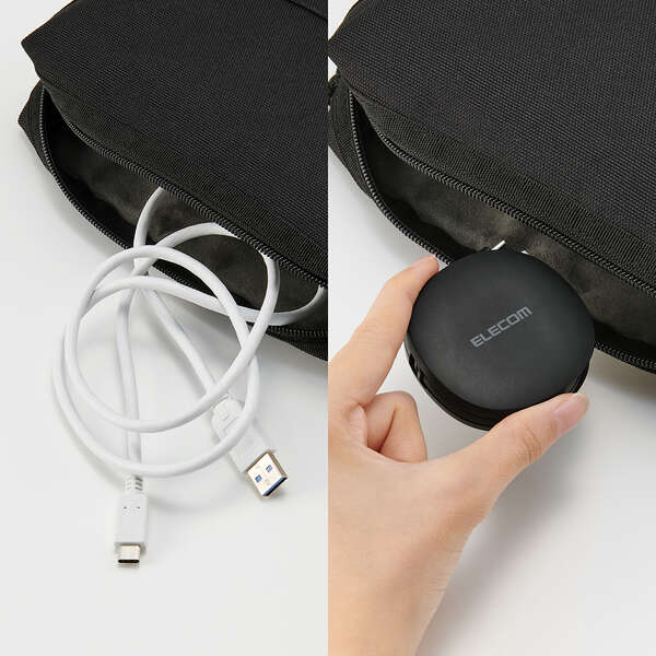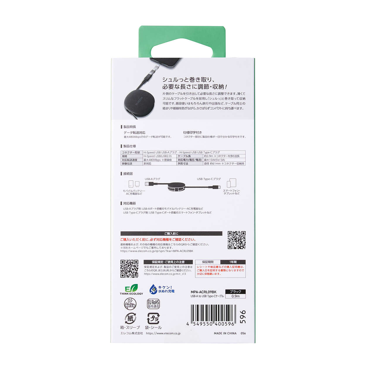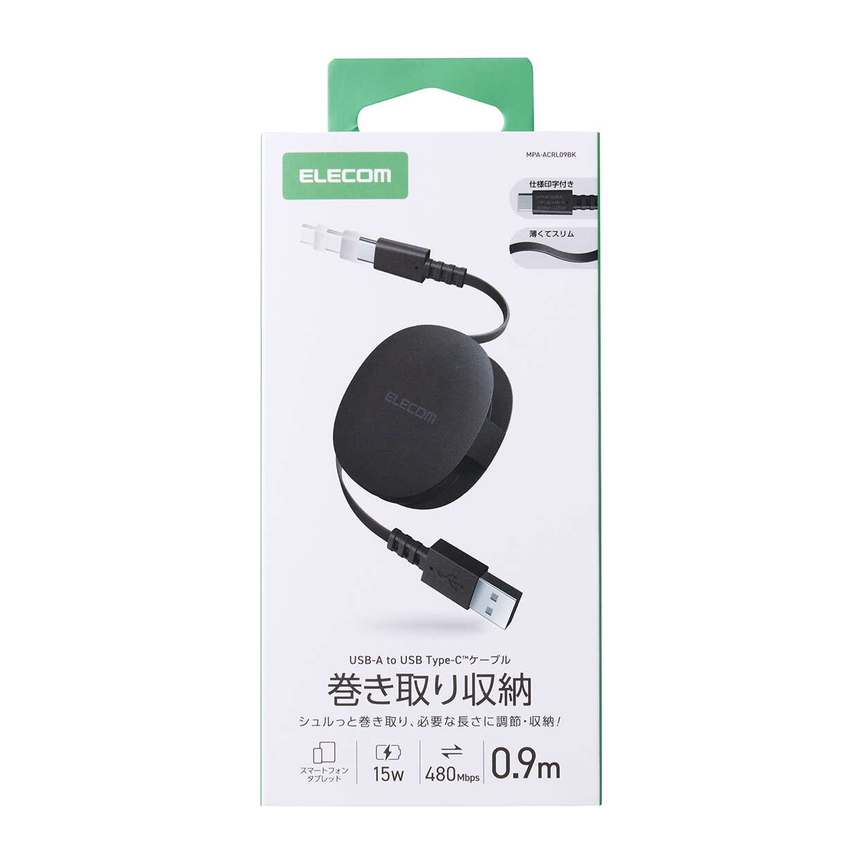 シュルッと収納、絡まずすっきり。約90cmのケーブルがコンパクトにまとまる、巻き取り式のUSB-A - USB Type-C(TM)ケーブルです。手のひらサイズのケースで、持ち運びに便利。片手で引っ張って使える片側巻き取り式です。