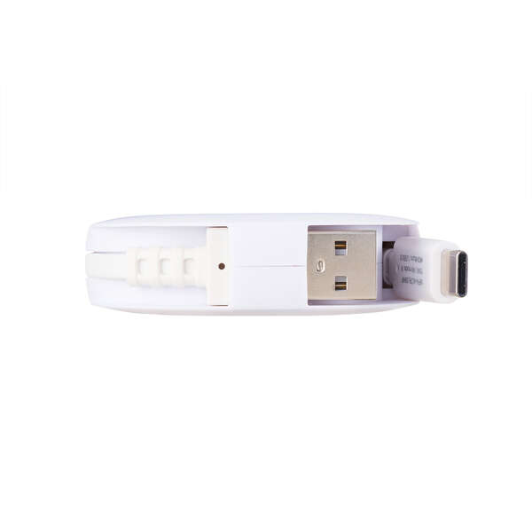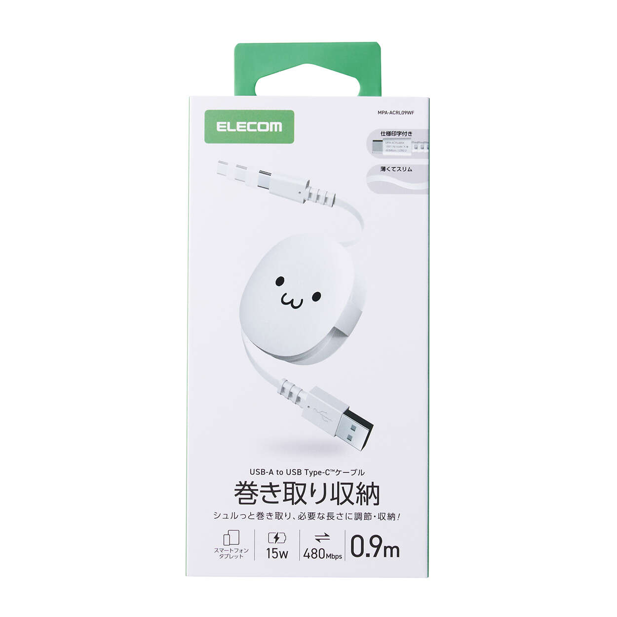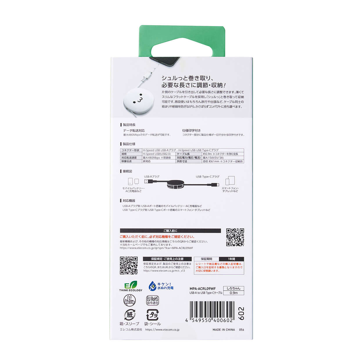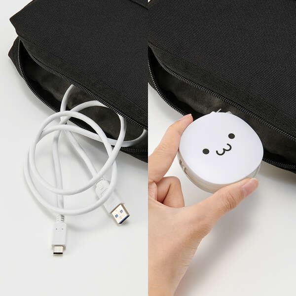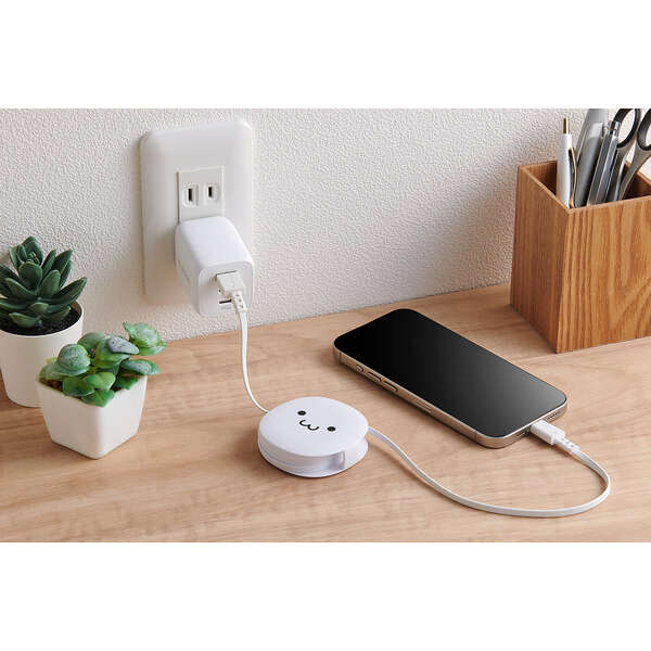 シュルッと収納、絡まずすっきり。約90cmのケーブルがコンパクトにまとまる、巻き取り式のUSB-A - USB Type-C(TM)ケーブルです。手のひらサイズのケースで、持ち運びに便利。片手で引っ張って使える片側巻き取り式です。かわいいしろちゃんモデルです。