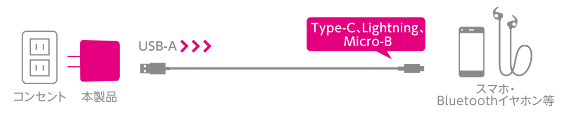家庭用コンセントからスマートフォン等を充電、給電できるAC充電器です。