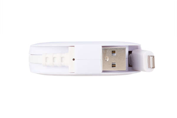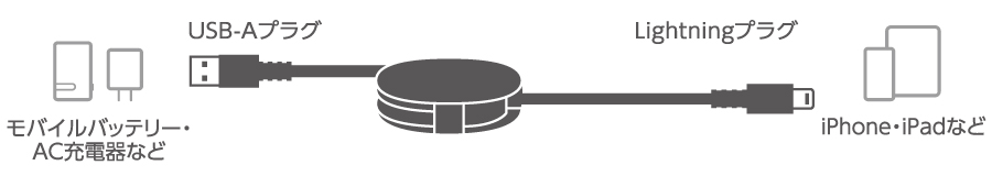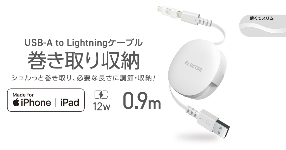 シュルッと収納、絡まずすっきり。約90cmのケーブルがコンパクトにまとまる、巻き取り式のUSB-A - Lightningケーブルです。手のひらサイズのケースで、持ち運びに便利。片手で引っ張って使える片側巻き取り式です。