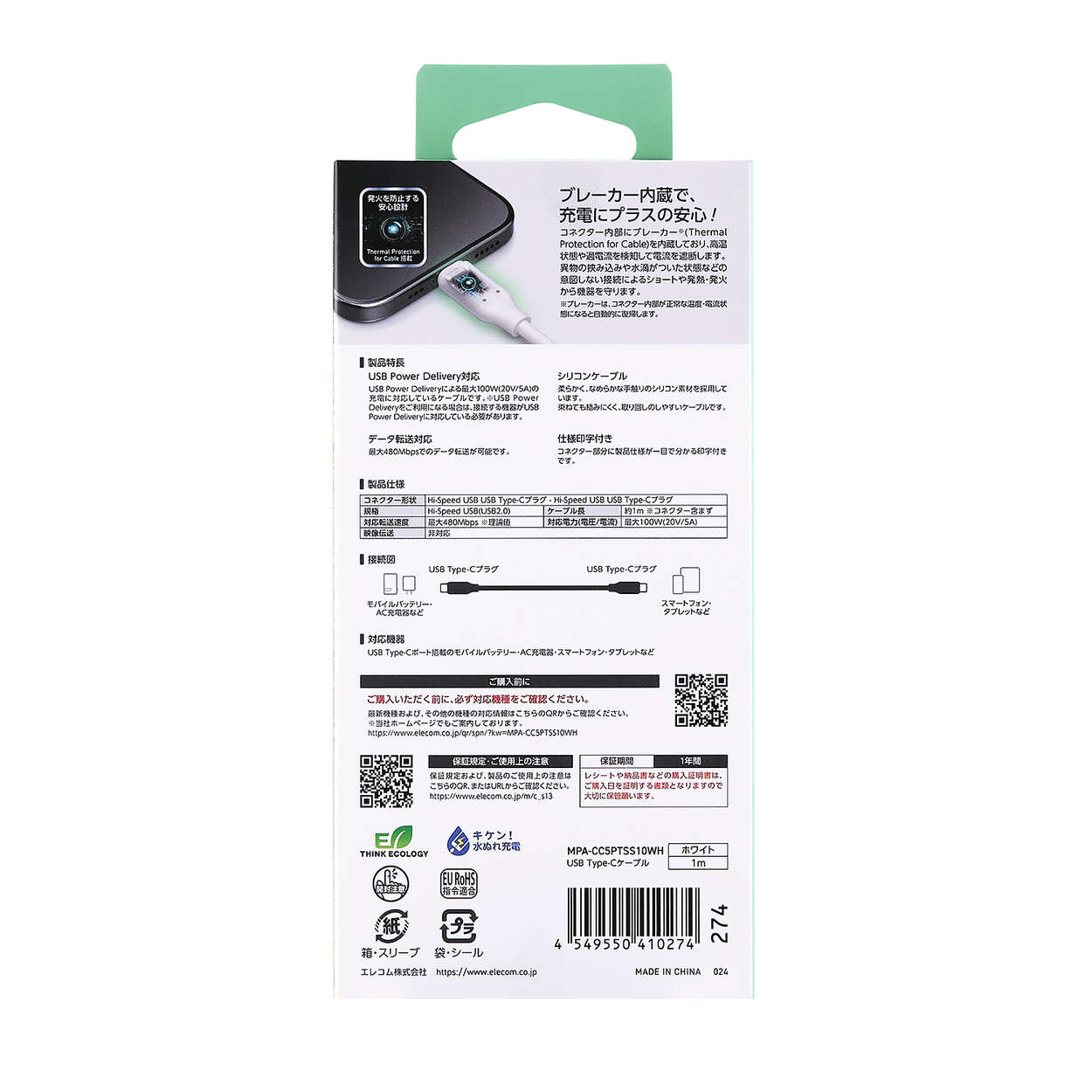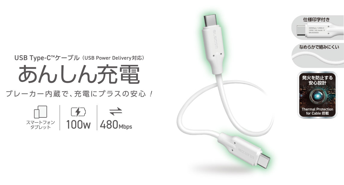 安心と使いやすさを両立!異物の挟み込みや水濡れなどの意図しない接続によるショートや発熱・発火を検知し、自動で電流を遮断するブレーカーを搭載したUSB Type-C(TM)ケーブルです。なめらかな手触りで、やわらかく扱いやすいシリコン素材を採用しています。AC充電器やモバイルバッテリー、スマートフォンやタブレットなど、USB Type-Cポート搭載の機器同士を接続して、充電やデータ転送ができます。