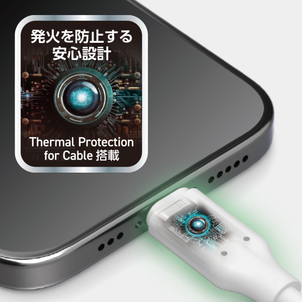 USB Type-Cコネクター内部にブレーカー(Thermal Protection for Cable)を内蔵しているので、高温状態や過電流を検知して電流を遮断。異物の挟み込みや水滴がついた状態など、意図しない接続によるショートや発熱・発火から機器を守ります。