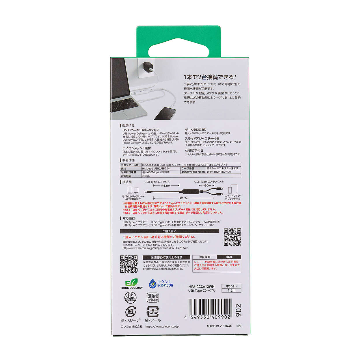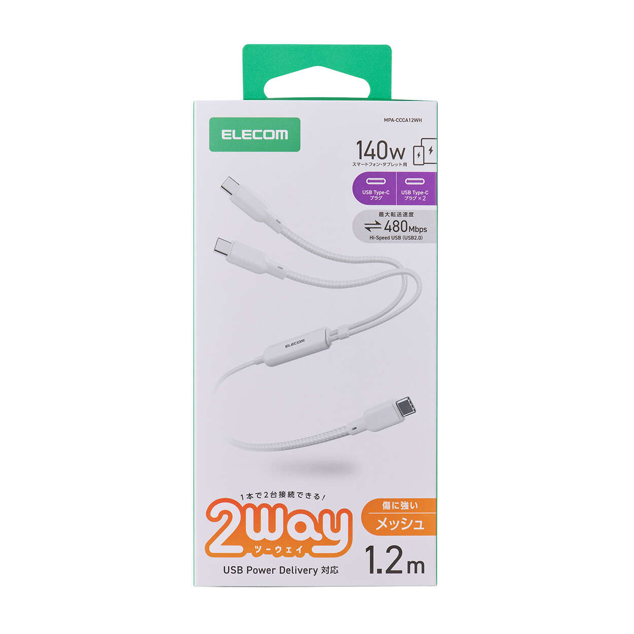 USB Type-C(TM) - USB Type-C 2WAYケーブル(USB2.0/140W/メッシュ)(MPA-CCCA12WH)