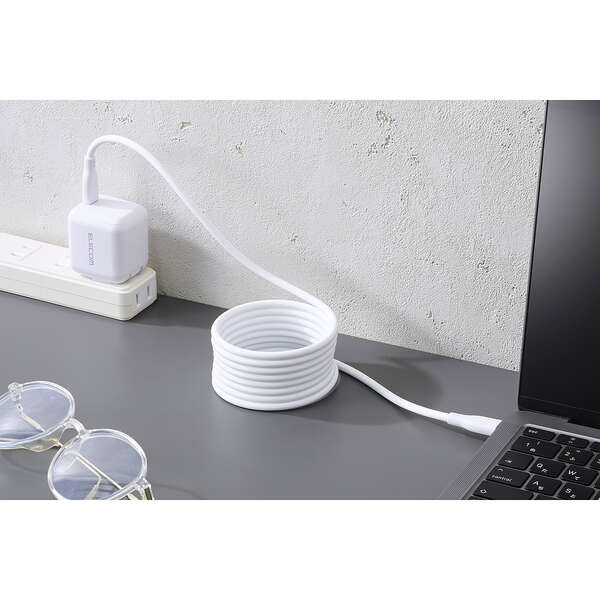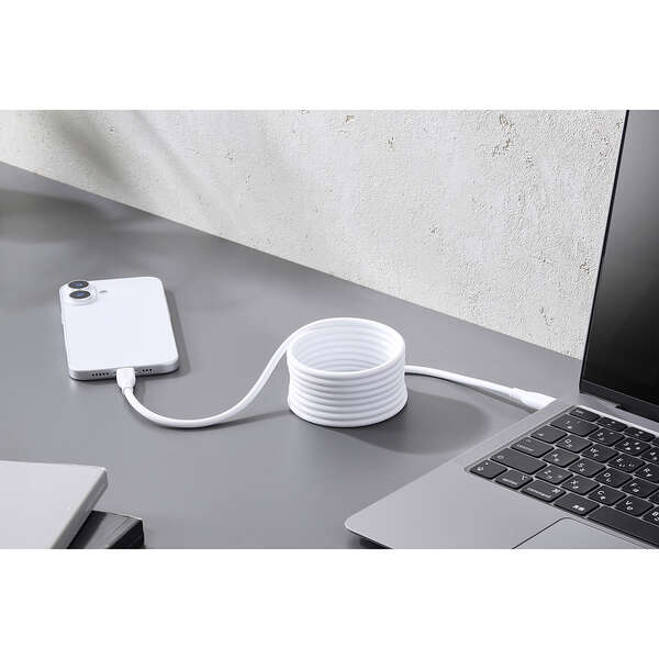 シリコン×磁石の力で、くるんとまとまり小さく収納!持ち運びに便利なUSB Type-C(TM)ケーブルです。鉄製の机や棚に吸着し、配線を自在にアレンジできます。なめらかで絡みにくいシリコン素材を採用。USB Power Delivery最大60Wの充電に対応し、スマートフォンやタブレットなどを充電できます。