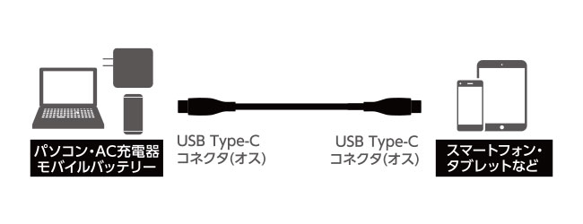 USB Type-C™端子を搭載しているパソコン及び充電器・モバイルバッテリーなどに、USB Type-C™端子を搭載しているスマートフォンやタブレットを接続し、充電やデータ転送ができるUSB2.0ケーブルです。