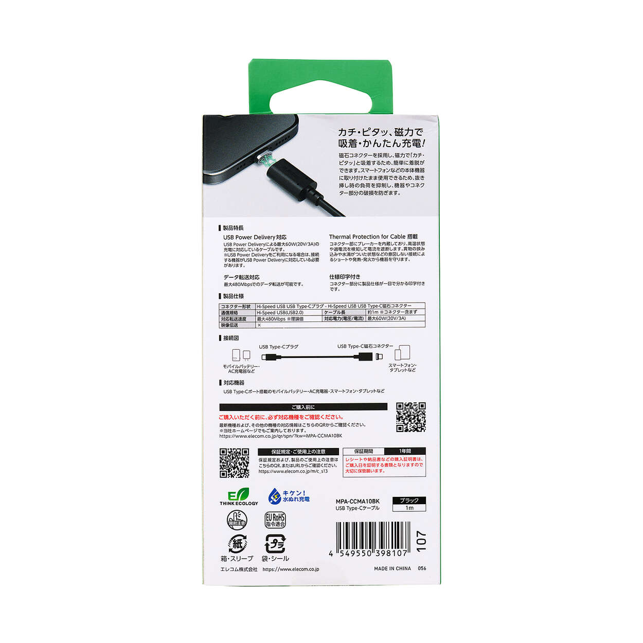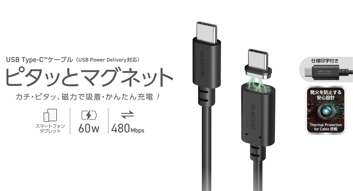 ピタッとくっついて、かんたん着脱&充電!磁力でしっかり接続するUSB Type-C(TM)着脱式コネクターを片側に採用した、USB Type-Cケーブルです。端子をスマートフォンなどの機器に挿したまま、ワンタッチでケーブルの着脱が可能。充電時に抜き挿しする手間がなくなり、機器やコネクター部分への負荷も軽減して長く快適に使用できます。コネクター部分にブレーカーを内蔵しているため、ホコリなどが入っても接続時のショートを防止して機器を守る安心設計です。
