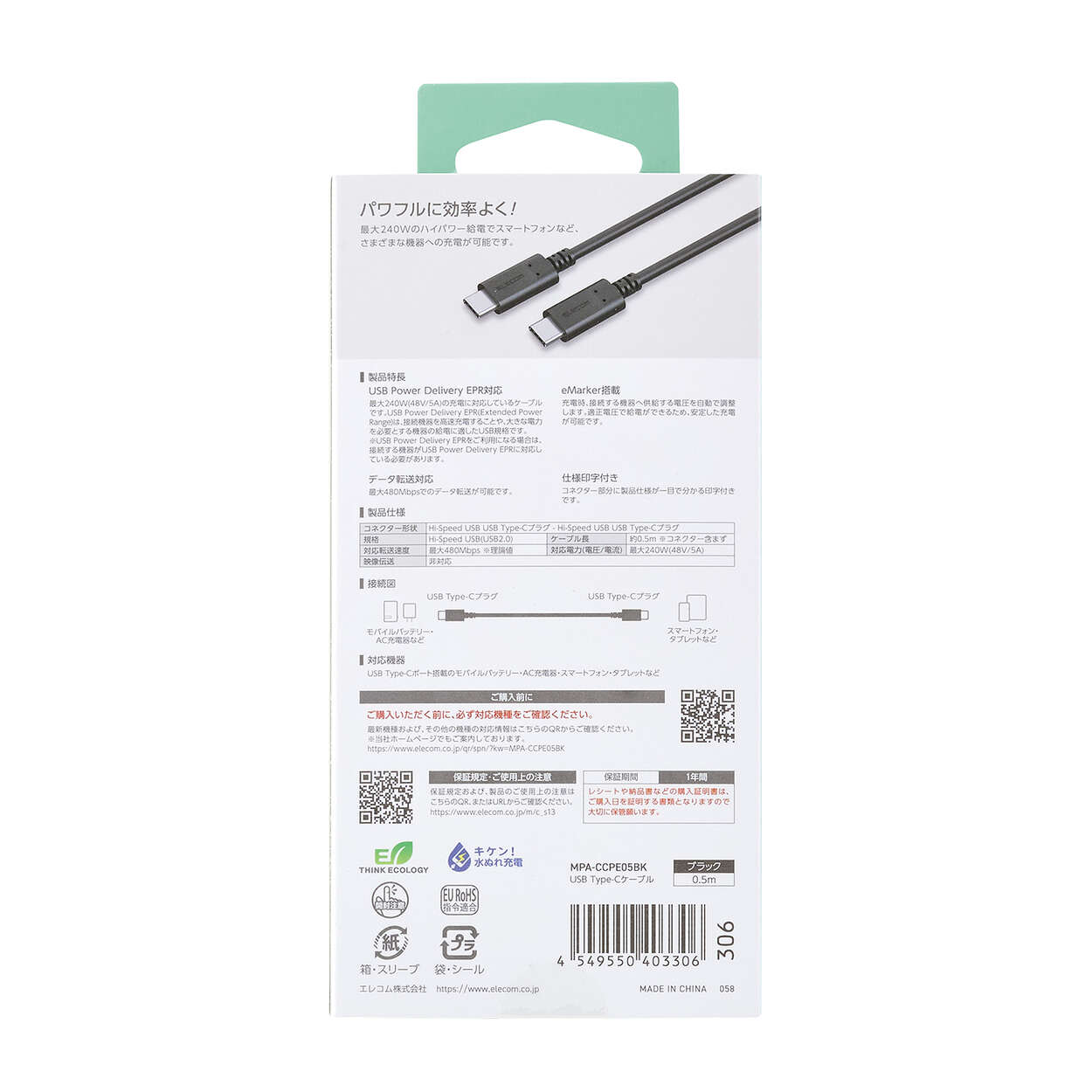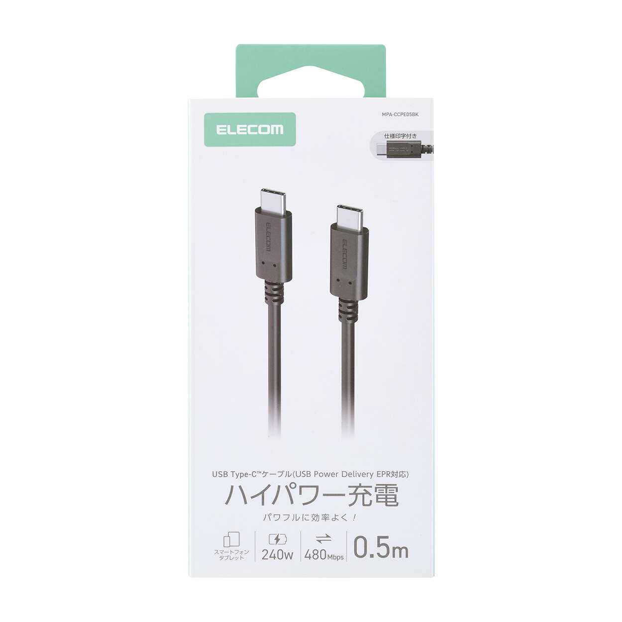 USB Power Delivery EPRに対応し、最大240Wでパワフルかつ効率的に充電できるUSB Type-C(TM)ケーブルです。スマートフォンやノートパソコンなど、さまざまな機器の充電と、最大480Mbpsでのデータ転送が可能です。