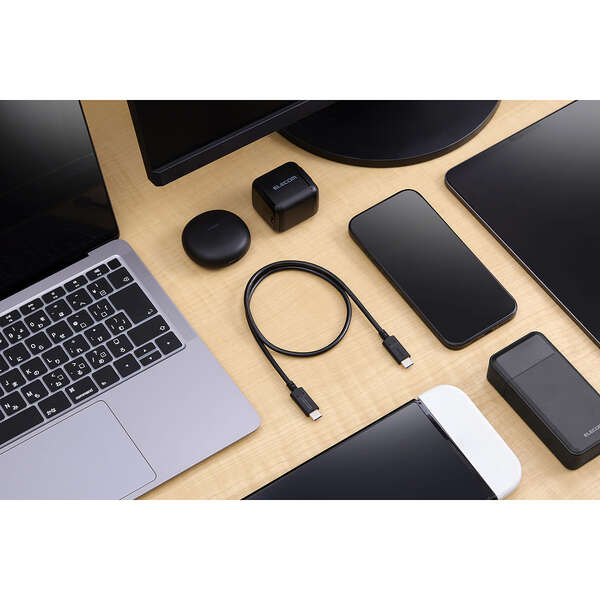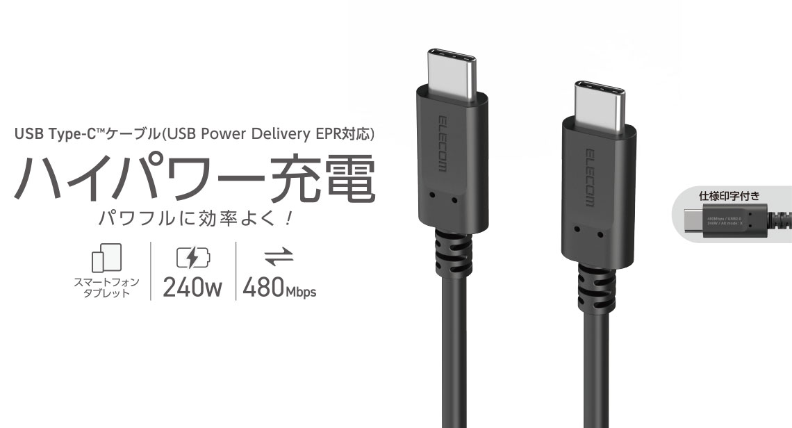 最大240Wのハイパワーで充電できるUSB Type-C™ - USB Type-Cケーブルです。スマートフォンやタブレット、ノートパソコンなどへの充電とデータ通信が可能です。