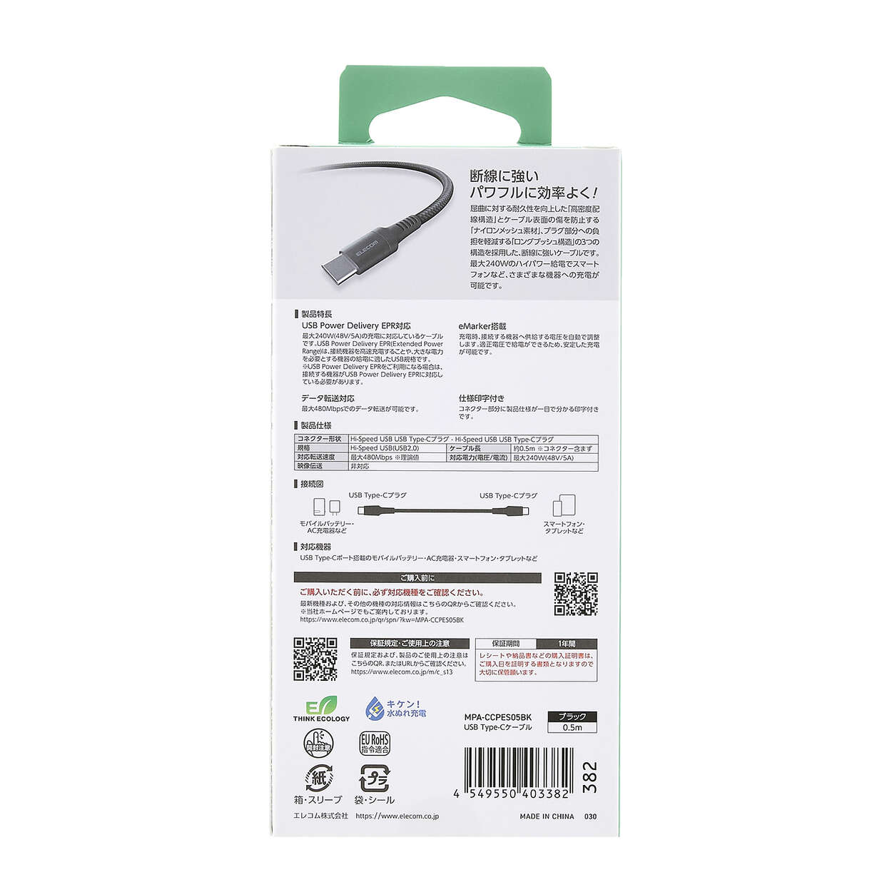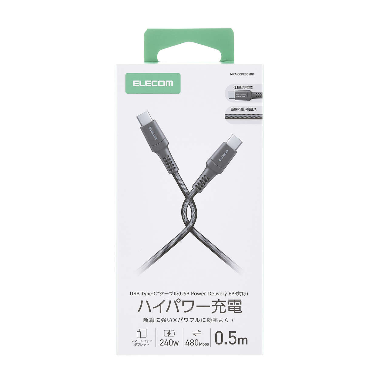 ナイロンメッシュ素材、高密度配線、ロングブッシュを採用した、断線に強い高耐久仕様のUSB Type-C(TM)ケーブルです。最大240Wのハイパワー充電で、スマートフォンやノートパソコンなどさまざまな機器への充電と、最大480Mbpsでのデータ転送が可能です。