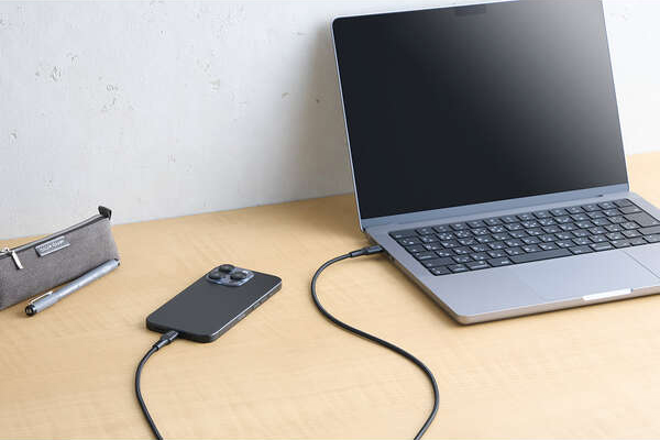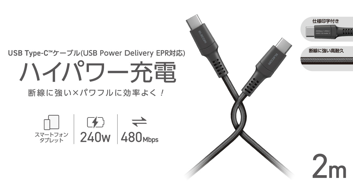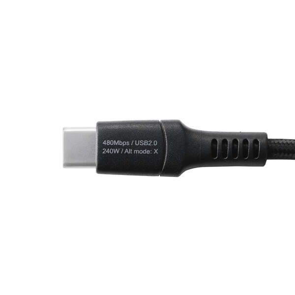 ナイロンメッシュ素材、高密度配線、ロングブッシュを採用した、断線に強い高耐久仕様のUSB Type-C(TM)ケーブルです。最大240Wのハイパワー充電で、スマートフォンやノートパソコンなどさまざまな機器への充電と、最大480Mbpsでのデータ転送が可能です。
